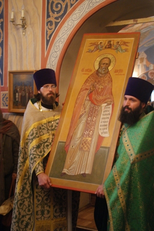 Протоиерей Николай Чернышев, временно исполняющий обязанности настоятеля храма святителя Николая в Кленниках, преподнес Владыке Игнатию икону Божией Матери с молящимися перед Нею святым праведным Алексием и священномучеником Сергием, написанную иконописцами храма.