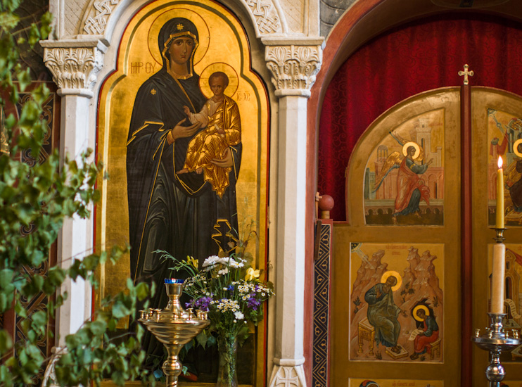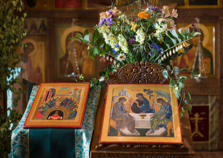 Праздничное богослужение дня Святой Троицы – Божественная Литургия и вечерня с чтением коленопреклоненных молитв. Убранство храма составляют березовые ветви, цветы и приносимое окружающей нас природой разнотравье.